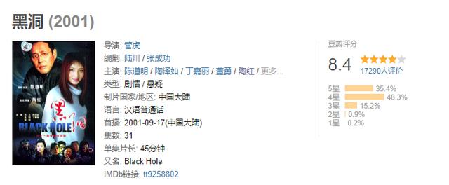 电视剧豆瓣评分8.4,比《破冰行动》高了1.3分。剧中所涉及到的贪污腐败、黑社会团伙、违法杀人比《破冰行动》有过之而无不及,此剧开启了一个时代的犯罪片。直到现在,很多观众还是慕名在网上观看《黑洞》。